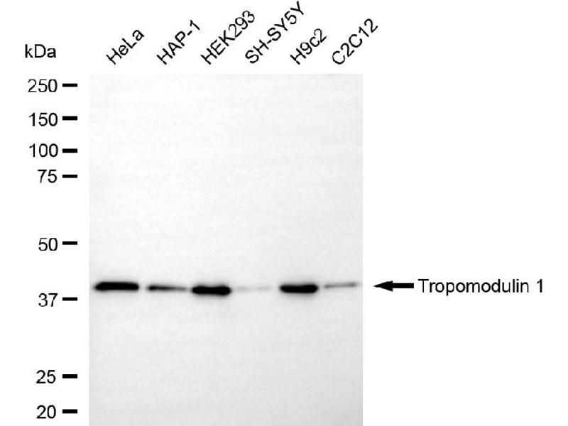 This gene encodes a member of the tropomodulin family. The encoded protein is an actin-capping protein that regulates tropomyosin by binding to its N-terminus, inhibiting depolymerization and elongation of the pointed end of actin filaments and thereby influencing the structure of the erythrocyte membrane skeleton. Multiple transcript variants encoding the same protein have been found for this gene. [provided by RefSeq, Oct 2009].