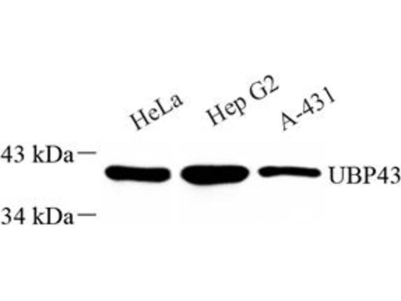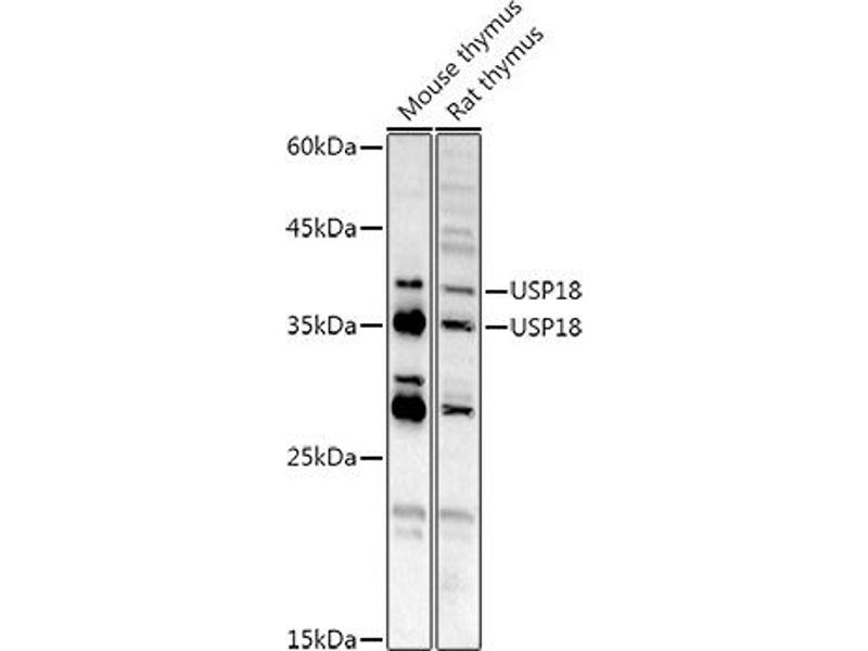 The protein encoded by this gene belongs to the ubiquitin-specific proteases (UBP) family of enzymes that cleave ubiquitin from ubiquitinated protein substrates. It is highly expressed in liver and thymus, and is localized to the nucleus. This protein efficiently cleaves only ISG15 (a ubiquitin-like protein) fusions, and deletion of this gene in mice results in a massive increase of ISG15 conjugates in tissues, indicating that this protein is a major ISG15-specific protease. Mice lacking this gene are also hypersensitive to interferon, suggesting a function of this protein in downregulating interferon responses, independent of its isopeptidase activity towards ISG15. [provided by RefSeq, Sep 2011].